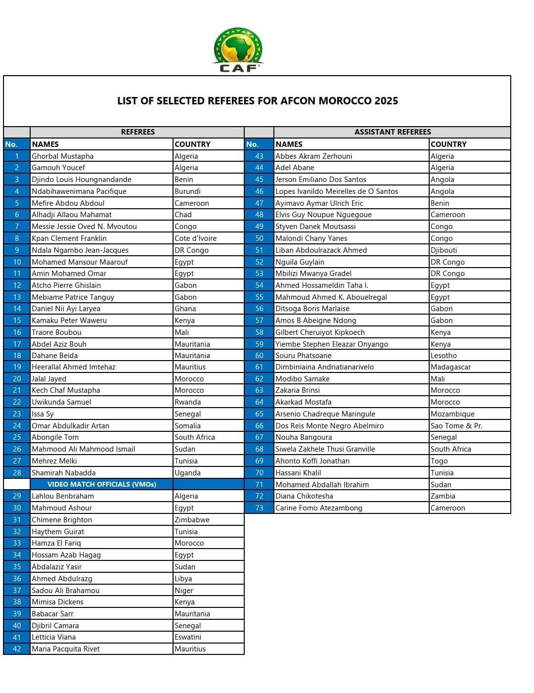 أعلنت الكونفدرالية الإفريقية لكرة القدم عن اللائحة الرسمية للحكام المعيّنين لإدارة مباريات كأس إفريقيا للأمم “المغرب 2025”، حيث ضمت القائمة خمسة أسماء مغربية جاءت موزعة بين حكام الساحة، الحكام المساعدين، وحكام تقنية الفيديو.