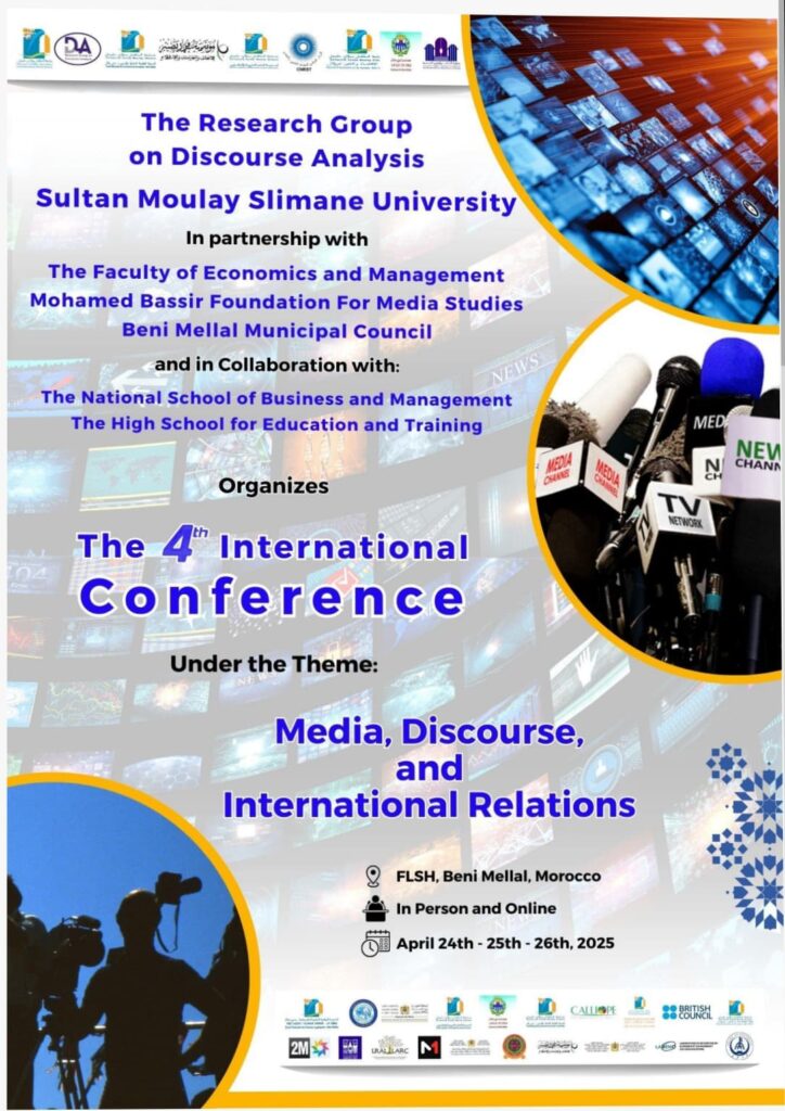 ينظم فريق البحث في تحليل الخطاب التابع لكلية الآداب والعلوم الإنسانية، جامعة السلطان مولاي سليمان ببني ملال و مجموعة من الشركاء الذين يمثلون مؤسسات حكومية وغير حكومية من المغرب ومن الخارج، من بينهم وزارة الشباب والثقافة والتواصل – قطاع التواصل-، المؤتمر الدولي الرابع حول موضوع ” الإعلام، الخطاب والعلاقات الدولية ” خلال الفترة الممتدة من 24 إلى 26 أبريل 2025.