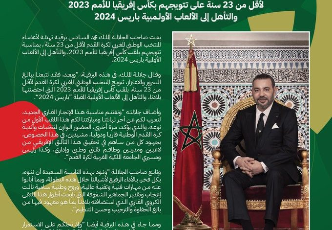 بعث جلالة الملك محمد السادس نصره الله و أيده، ببرقية تهنئة إلى أعضاء المنتخب الوطني المغربي لأقل من 23 عاما بمناسبة تتويجه في القلب الإفريقي القاري.
