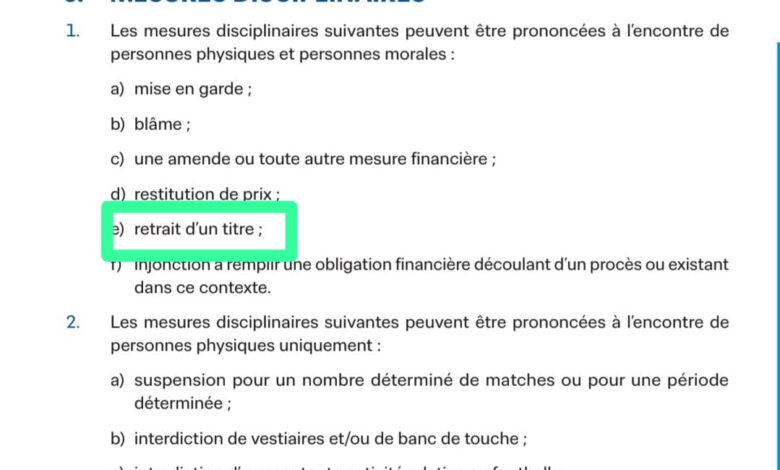 بالإضافة إلى المادة 6 من قانون الانضباط للفيفا التي تضع إنتزاع اللقب كخيار تأديبي.
