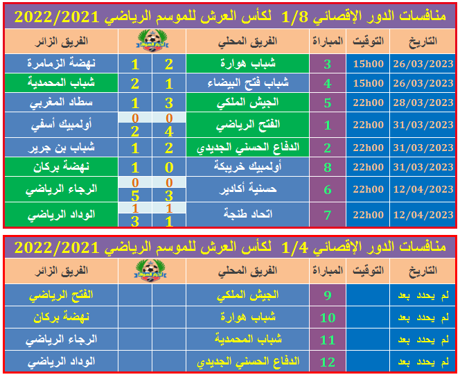 نتائج مباريات الدور 1/8 من منافسات كأس العرش لموسم 2021-2022